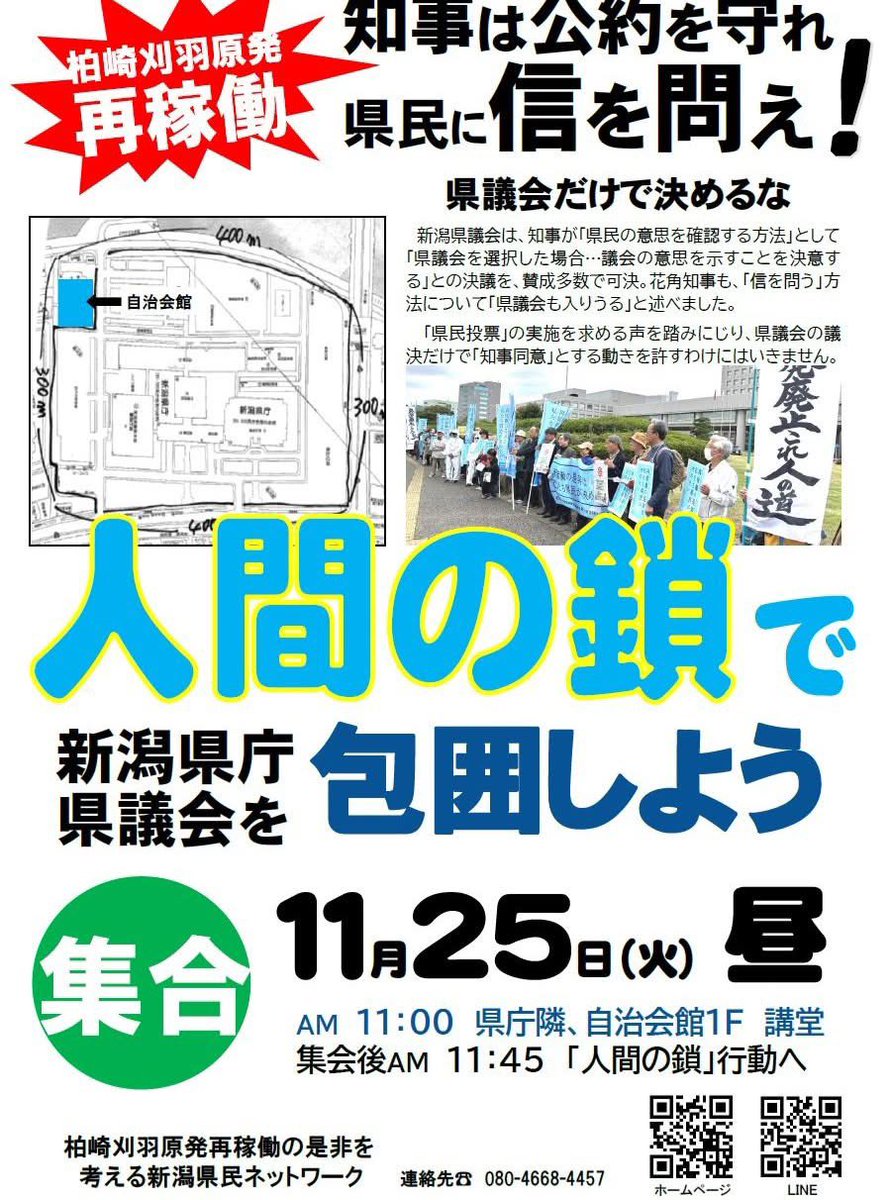 このまま、東京電力柏崎刈羽原子力発電所を再稼働させてはなりません。おそらく新潟県政史上初の県庁を取り囲む「人間の鎖」です。この問題に少しでも関心のある方は、どなたでも、ぜひご参加ください