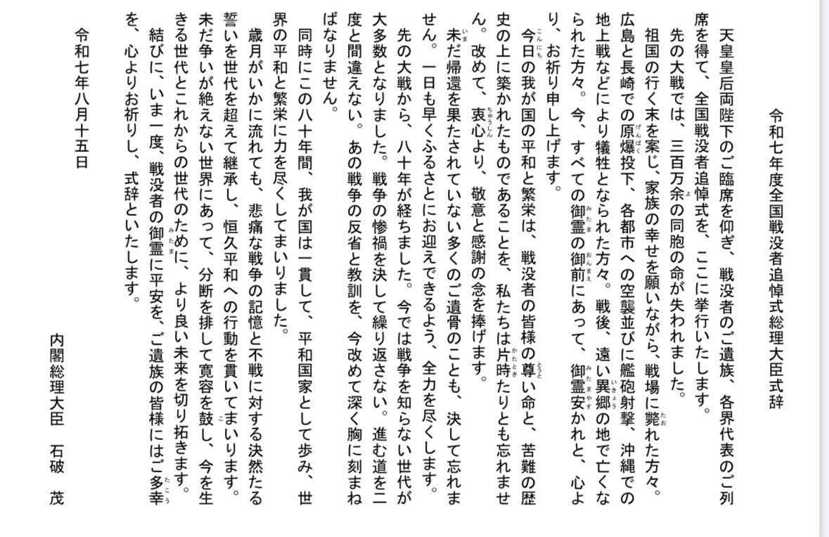 これはもう、式辞を越えて80年談話やろ。しかし素晴らしい。